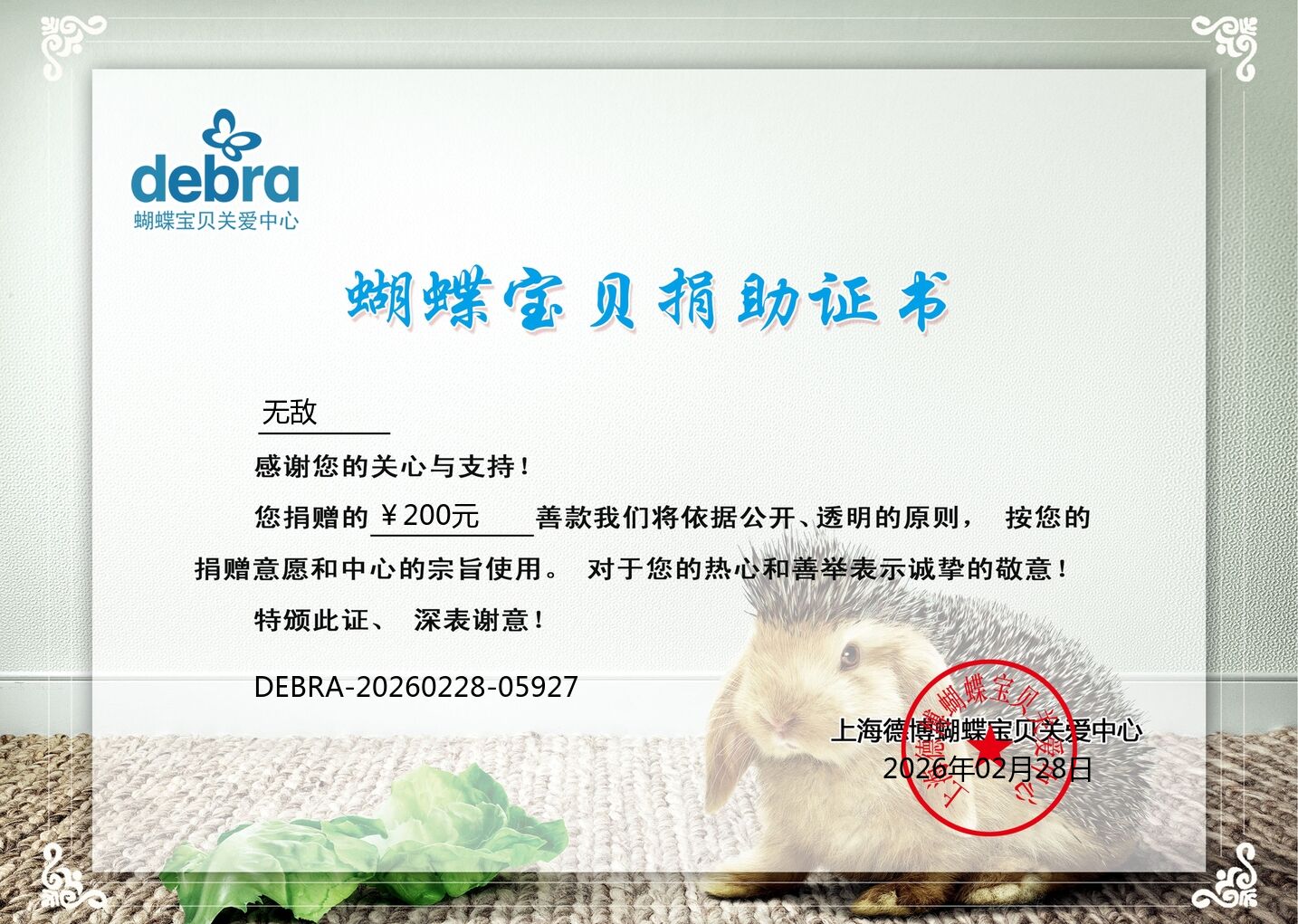 Thank you for the support to butterfly children and DebRA. You can click on the ID to download the certificate.