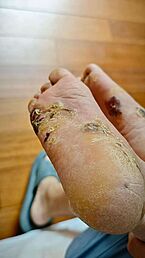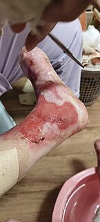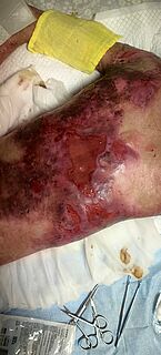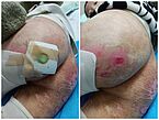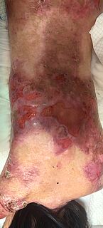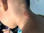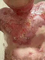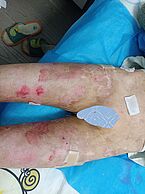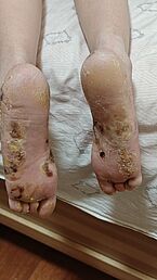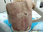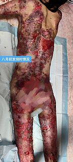 患者家属: 除了脚和脖子上,后边后背那一片也是伤口比较严重,而且反反复复。