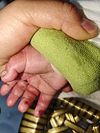 徐子刚医生: 像现在有水疱的这种时候呢,你可以用一些油纱放在两指之间,防止粘连。并指其实就是粘连,情况很轻的时候要好一些,如果反复有水疱的时候,就一定要在中间放上油纱这类的东西进行间隔,防止它粘连。