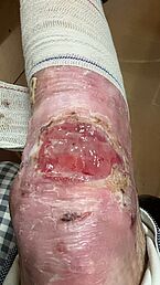 患者家属: 她腿上都还好,现在主要就是背后这个伤一直不愈合,用什么都不愈。