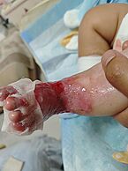 徐子刚医生: 那就是一样的,都是反复因为EB形成的这种牵拉。有些很严重的EB患者整个脚两边是翘起来的,几个脚趾头都在上面,有这种情况。那我们现在能做的还是用好敷料,让创面更快的一个恢复。越是创面大,越是恢复慢,越是反复的,越容易出现这种情况。