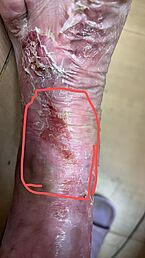 患者家属: 对,这个照片和刚刚那张是同一只脚,他就是这只脚比较严重,总是反反复复的。