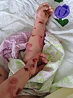 患者家属: 孩子现在耳朵上面也开始反复的起疱了,我天天都在戳这些疱,但我没有进行包扎,因为...